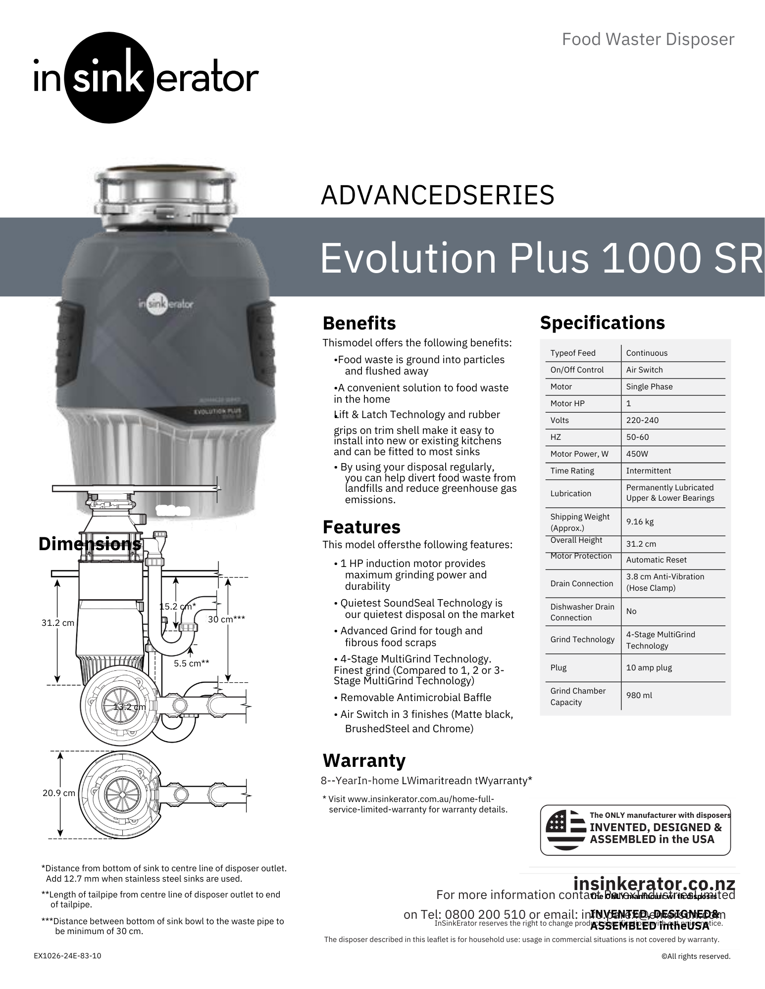 The Evolution Plus 1000 SR is designed to handle larger volumes of food waste with ease. Rather than dumping scraps into the bin, where they can rot and cause smells, this disposer grinds them into fine particles for safe drainage. Its powerful motor and advanced grinding stages make it ideal for busy kitchens wanting a cleaner, more sustainable waste solution.